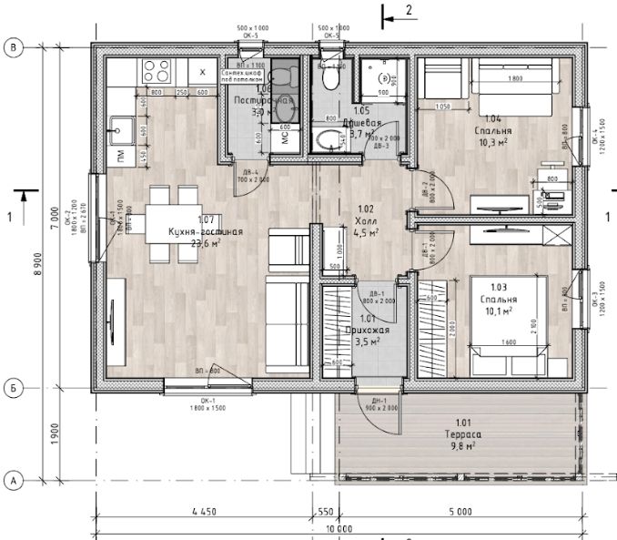 Проект одноэтажного каркасного дома 68 м². БАРИ