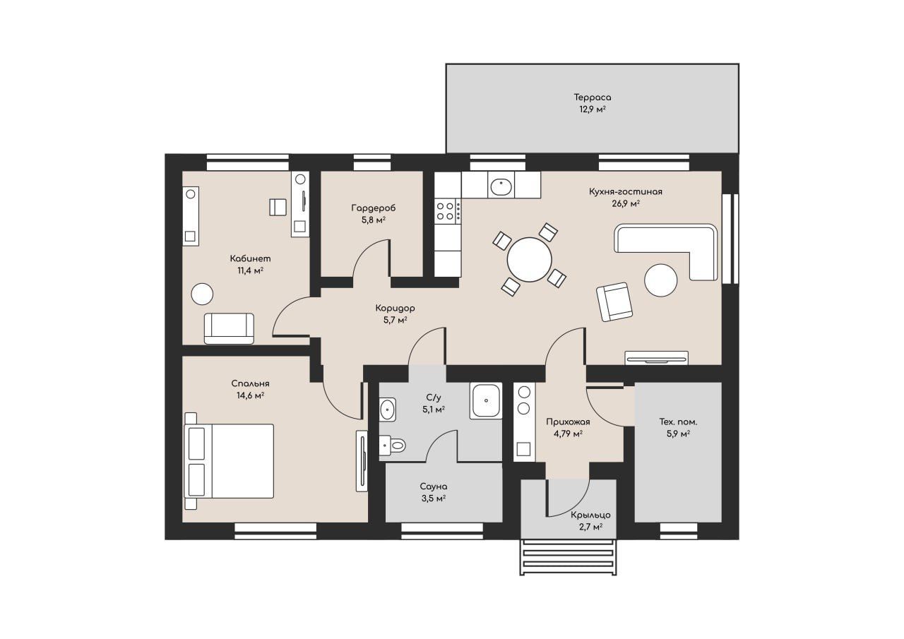 - Кухня-гостиная: 26 м²